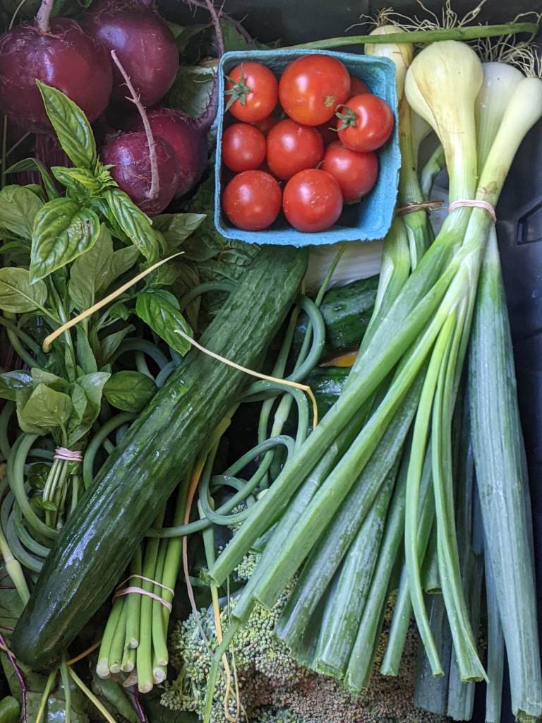 Notre ferme offre des paniers hebdomadaires de légumes, de fruits et de fines herbes selon le modèle de l’agriculture soutenue par la communauté (formule ASC). Nous cultivons actuellement sur 0,8 hectare.